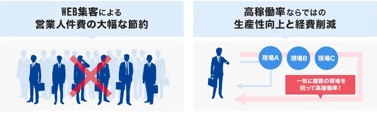 宣伝展開をインターネットだけに限定し、人を使ったセールス活動を行わないことで過大な営業費やTVCMなどの広告宣伝費を抑制したり、施工の稼働率を上げることで単価を抑制しているようです。