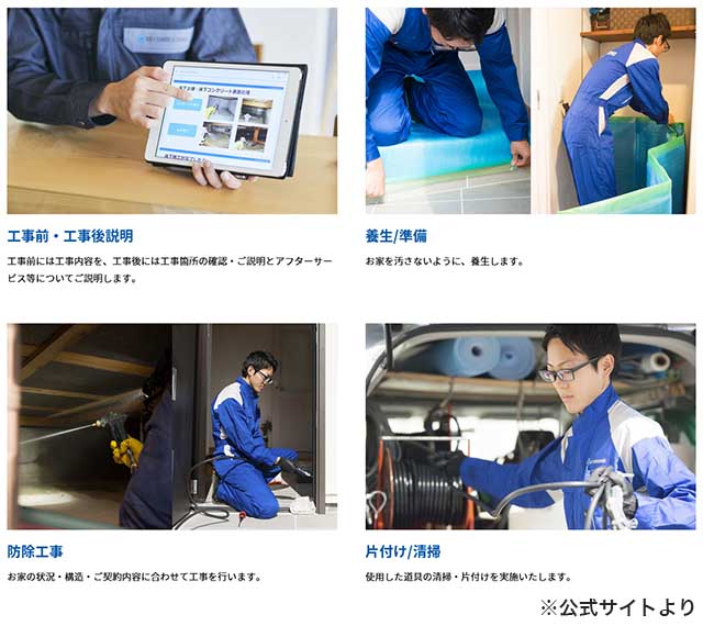 実際の施工は、日本しろあり対策協会の防除施工標準仕様をもとに専属技術員が担当し、独自の薬剤選定基準で住まいに合わせた施工方法を提案してくれます。
