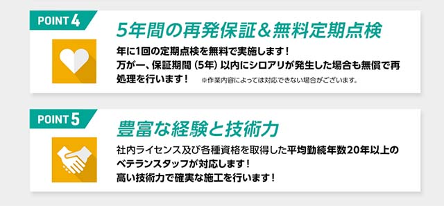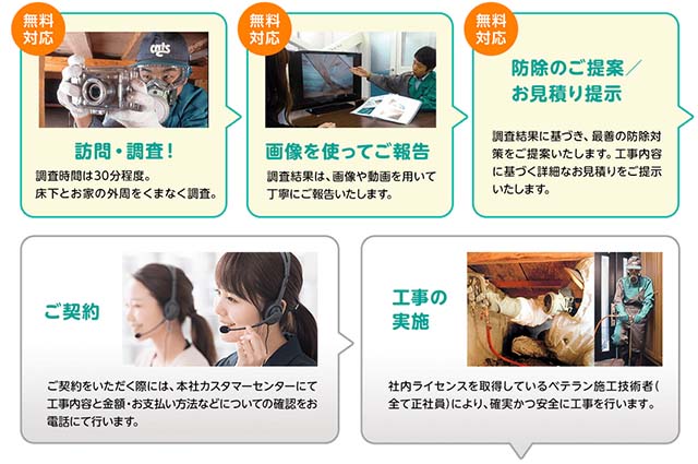 施工は全て自社スタッフが対応してくれ、一般的な薬剤を散布するバリア工法以外にも、オプションで独自に開発した工法も選ぶことができます。